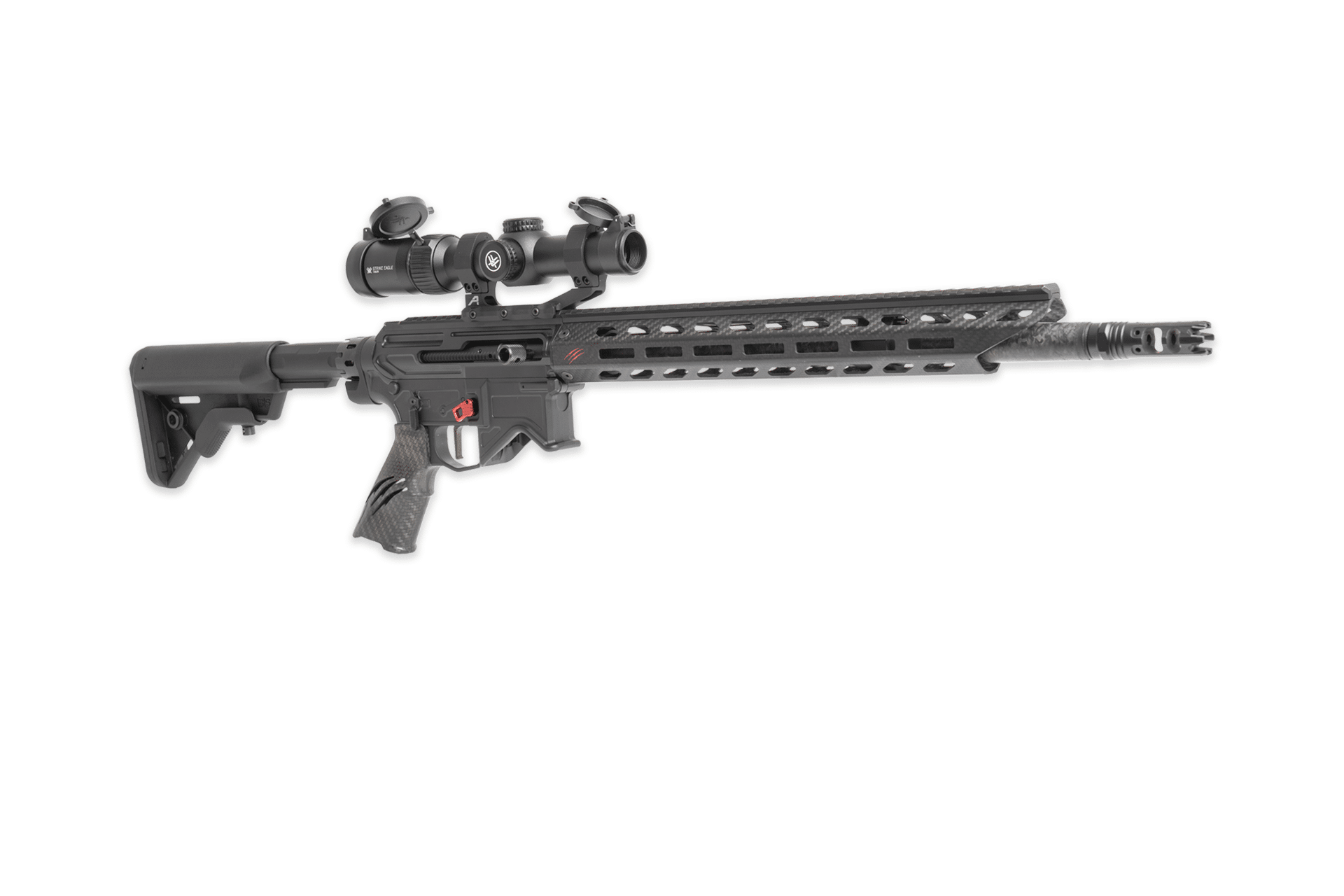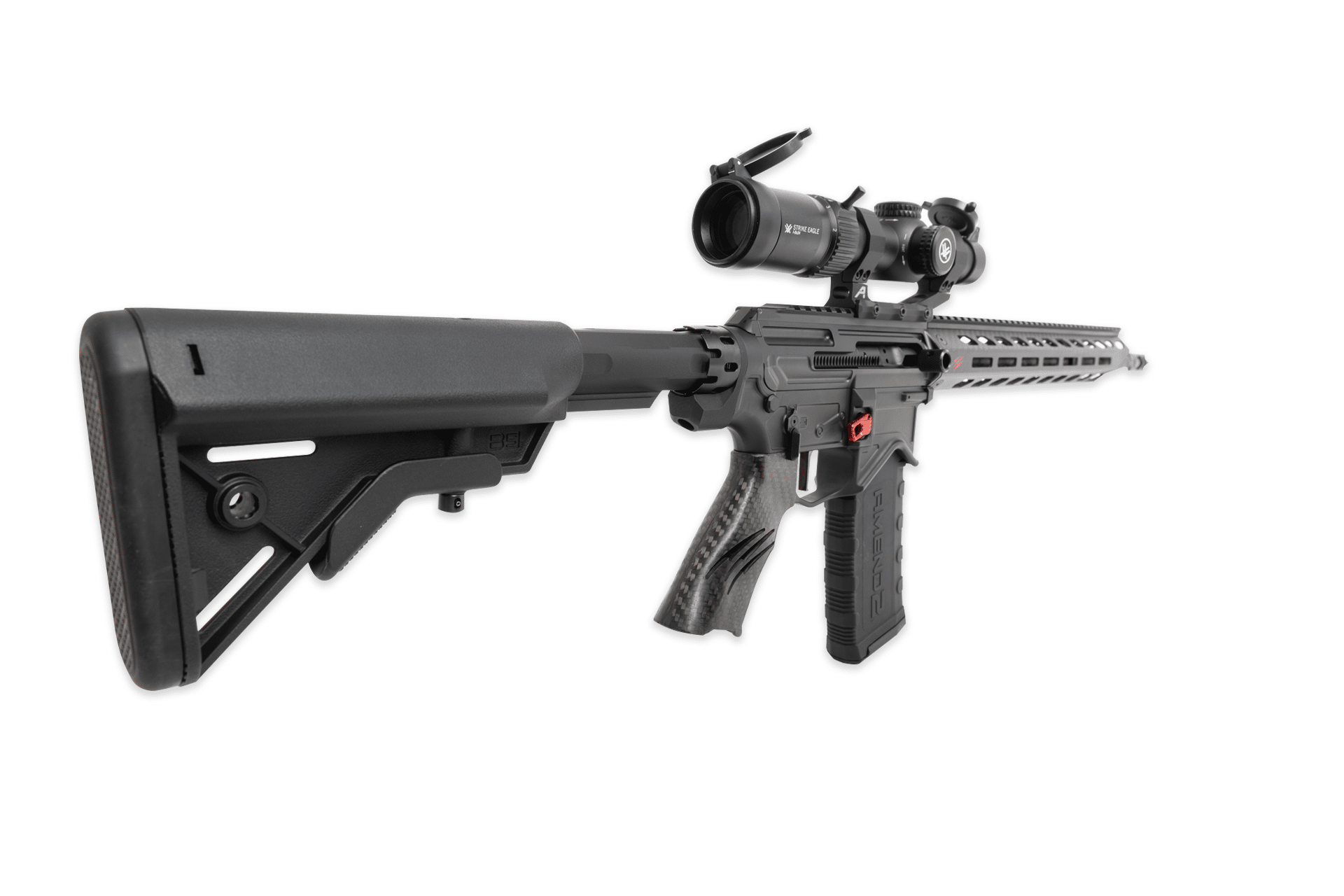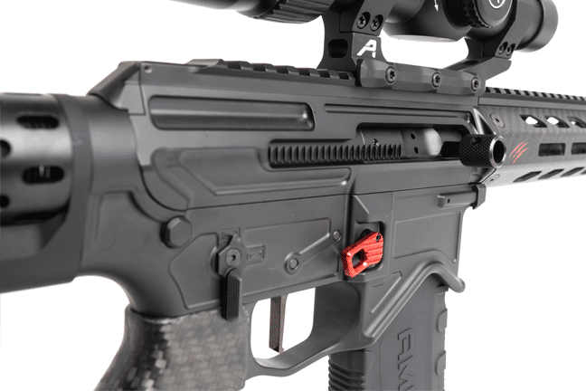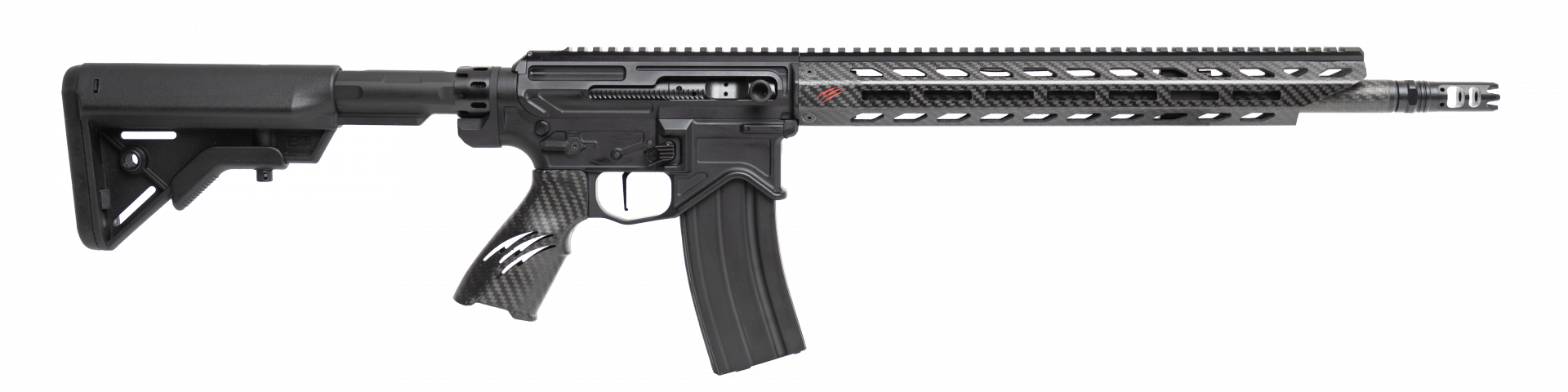 The Fierce F15 Sidewinder is our enhanced version of the traditional AR-15. The lightweight precision machined aluminum receiver is combined with Hi-Tech carbon fiber components throughout. The major feature of the F15 is the side charging handle. This will ensure quick easy access to charge the rifle with larger and oversized mounted scopes. An additional benefit is the ability to remain focused on target while simultaneously charging.